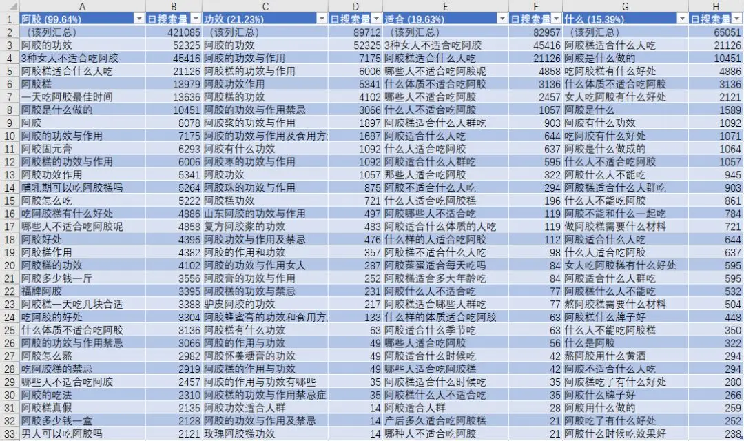 第二张图是我从百度于2019年10月28日获取的数据,每天百度上真实地搜索“阿胶”相关的关键词基本都在这里了。无论你怎么想破脑袋,你也想不出用户是这样在搜索的。图二的数据,即使有些从事了10年搜索引擎流量运营的人,从来都没看到过的。