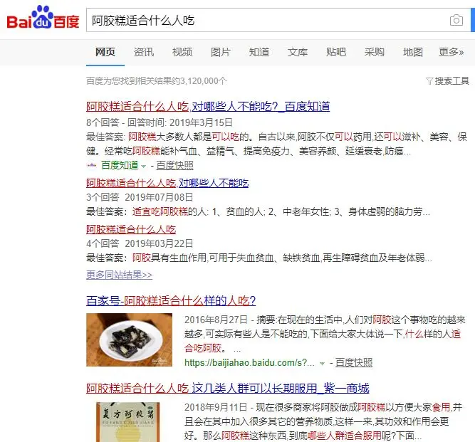 从上面的词库可以看出:“阿胶糕适合什么人吃“有2万多一天的搜索量,去百度一下这个词,我现在在杭州搜索,发现是一个广告都没有人投的。(不排除其他地方有或者当你看的时候可能会有)