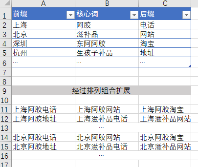 这种方法就是大家去定义一些和你的业务相关的核心词,如阿胶、滋补品等,再定义一些前缀和后缀等,然后再排列组合。这样出来的词就是: