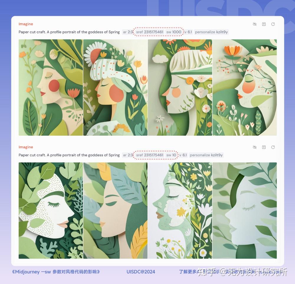 下面是同一组提示词,分别在 --sw 10 和 --sw 1000 时呈现的样式,二者差别还是非常明显的。0-1000 是一段非常充足的探索的区域,对于 100 以内的数值,我们可以以 25 为阶梯进行探索,比如 25 / 50 / 75;对于 100 以上的数值,可以 250 为阶梯进行探索,比如 250/500/750/1000。