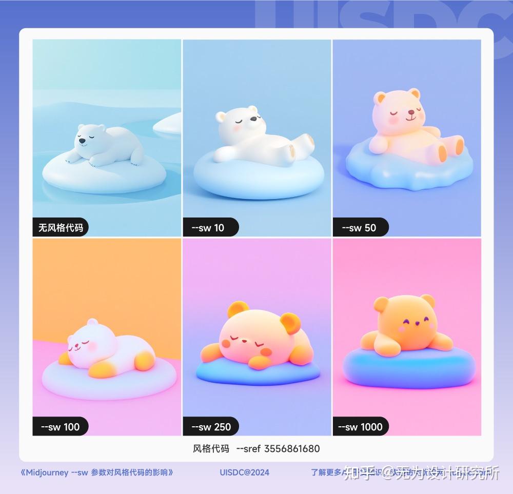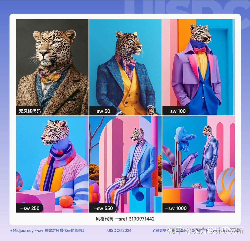 因此我们每次使用 --sref code 时,得到的仅仅是一种在 --sw 100 限制之下的效果; 而 --sw 的数值范围是 0 - 1000,如果我们一进步尝试其他不同的数值,比如 50、550、750 或 1000,就能得到更多不同的样式。