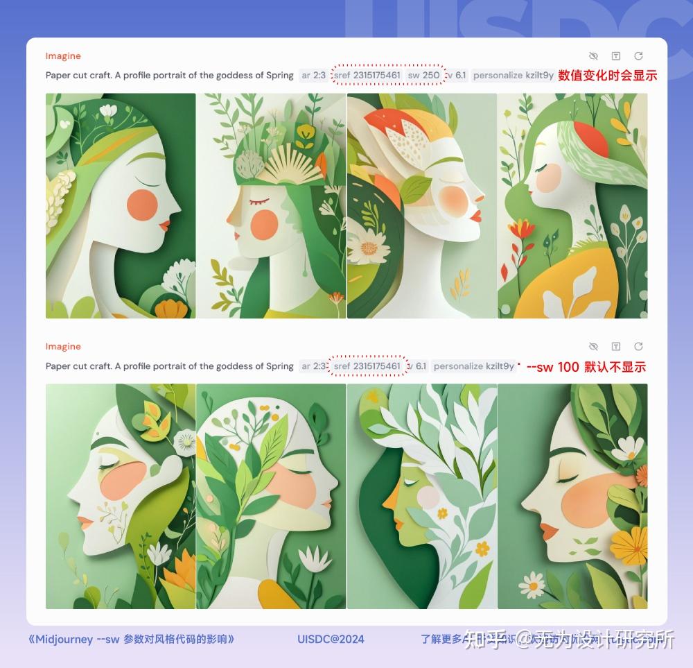 同样的,一旦在提示词中添加了 --sref 代码,我们的每次生成都会受 --sw 参数的影响:系统会自动在提示词中加上 --sw 100 这个参数, 但 100 的默认值,所以它并不会显示在提示词中,只有手动设置或使用了 100 以外的数值时,才能看见它。